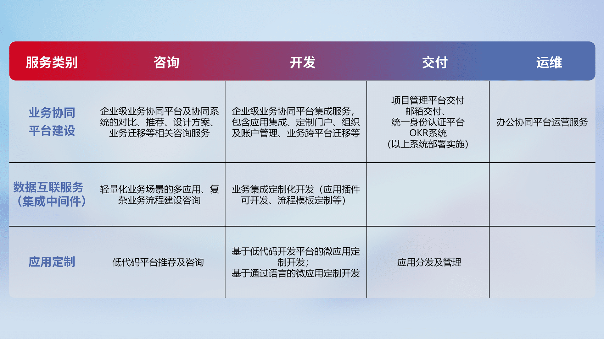 针对钉钉、、、企微、、、、IDaas等平台级产品提供产品的规划、、、、方案、、交付、、、定制化开发等服务,,,,实现如统一协同办公、、智能客户服务、、、混合会议管理、、、、智能数据查询、、、、等业务场景,,实现数字化转型。。